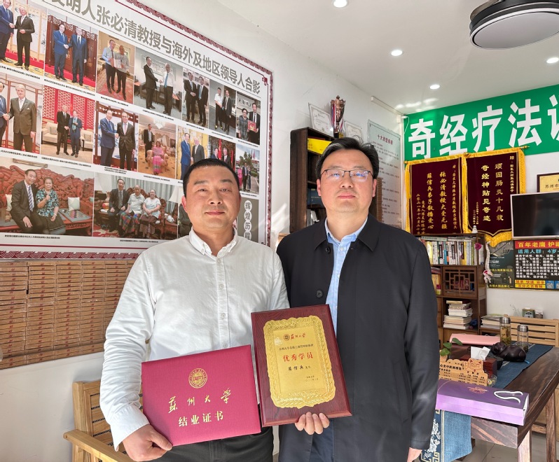 随后,调研组一行来到了苏州医心堂中医养生文化传播有限公司,薛信兵总经理(第三期高级工商管理研修班的学员、副班长)热情接待了调研组一行,缪爱国副院长为薛信兵总经理颁发了优秀学员奖章和结业证书并合影留念,并就高管班课程设置、教学安排等方面开展了交流。