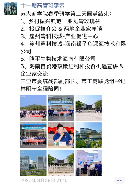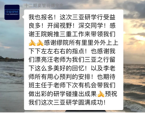 本次三亚研学之旅,高管学员们深入参访知名企业,与当地企业家展开深度交流。大家不仅开阔了视野,锤炼了战略思维能力,更有效地加深了彼此间的理解与信任,为后续合作筑牢根基。期待高管学员们在未来持续精进企业管理水平,开拓创新发展新思路,将研学所获切实转化为务实行动,助力中国民营经济迈向高质量发展新征程。