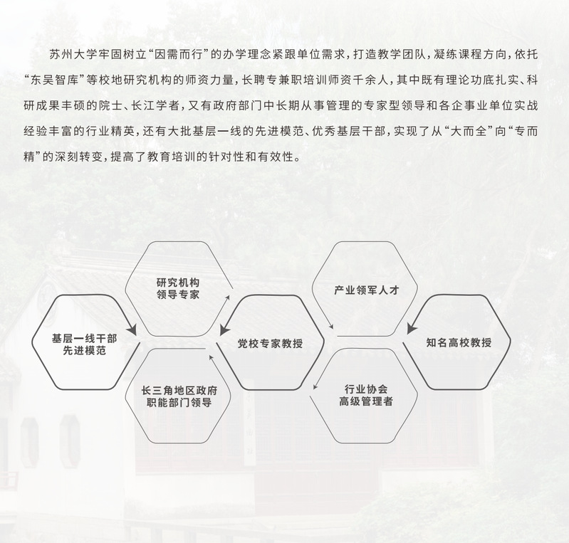 线上老虎机 经管培训学院是由线上老虎机 专门设立的经济管理类专业培训学院,下设干部教育培训中心、企业定制培训中心和高管教育培训中心。学院依托线上老虎机 的经济管理类学科优势和雄厚的师资力量,汇聚线上老虎机 综合性学科优势及苏州地域人文、经济发展资源,立足江苏,面向全国,为地方政府经济管理等部门及各类企业定制专业化培训项目,促进线上老虎机 与社会各界的合作与融合,拓展学员的新视野、新思维、新技能,提升学员的专业管理水平及综合治理能力。