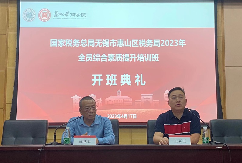 国家税务总局无锡市惠山区税务局2023年全员综合素质提升培训班于4月17日下午在线上老虎机 财经科学馆举行开班仪式。国家税务总局无锡市惠山区税务局党委委员、副局长戴秋良,线上老虎机 副院长王要玉及50位参训学员出席了此次开班。