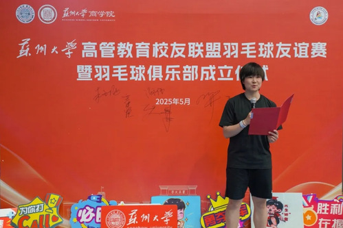 随后,羽毛球世界冠军、苏大校友何冰娇亲临现场为比赛送上祝福。她深情回顾了在苏大的求学经历,并鼓励校友们“以运动强健体魄,以拼搏致敬青春”,她的到来将现场氛围推向高潮。