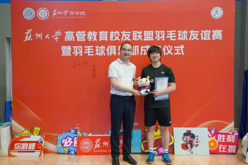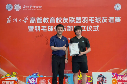 办公室主任胡勇、缪爱国副院长向何冰娇赠送了学院定制文创用品,何冰娇向学院赠送了羽毛球国家队定制服装。俱乐部未来将定期组织活动,搭建校友交流新桥梁。