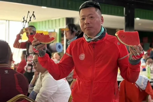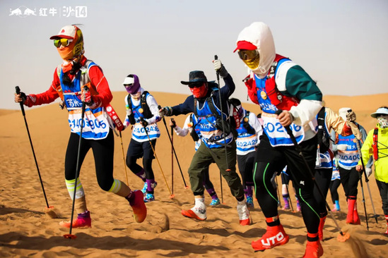 比赛首日,腾格里就给这群江南水乡来的“客人”上了残酷的一课。肆虐大风,沙粒像子弹般横扫裸露的皮肤,一有机会就溜进队员的眼睛、耳朵、衣服各处。第二天的烈日将沙漠烤成熔炉,穿越沙漠时的汗流浃背,完赛后通红的皮肤,都是队员坚强意志的体现。最后一天的冷雨来得猝不及防,冷雨和大风让沙漠变成更加难以穿越,队员们的脚底长出了水泡,膝盖也变得肿胀,但依然继续在沙漠中前行。时间在流逝,我们一直在与强者同行。