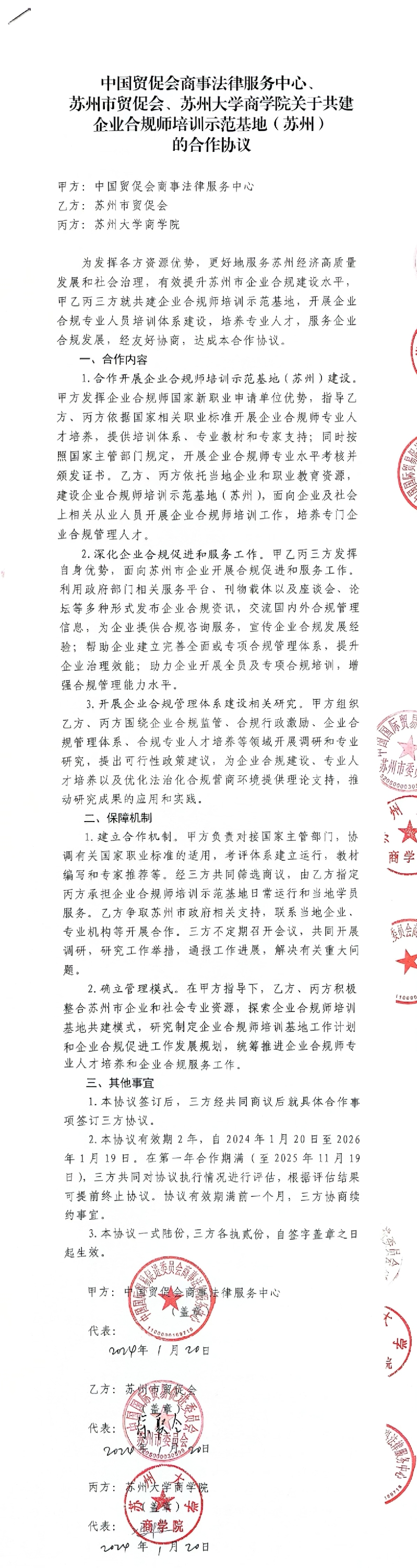 三方签约共建企业合规师培训示范基地。苏州基地为2024年第一家签约挂牌的基地,致力于推进企业合规专业人员培训体系建设,服务企业合规发展。