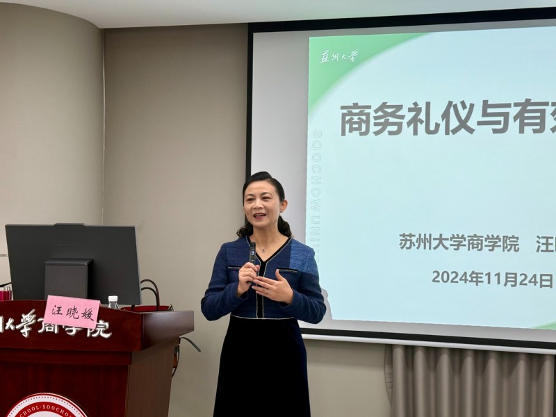 汪晓媛教授运用众多商务沟通的实例图片,进行了现场示范,详尽而生动地讲解了包括仪容仪表、行为举止、沟通技巧、社交礼节和商务谈判在内的多个领域。在互动环节进一步加深了对商务礼仪和高效沟通技巧的认识。这种学以致用的教学方式极大地激发了课堂的活力。