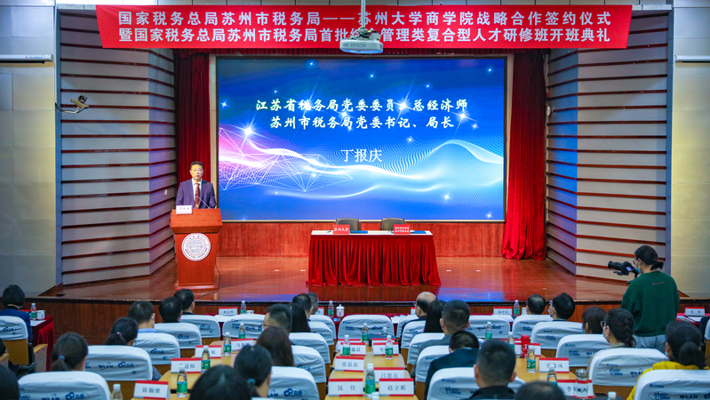 丁报庆表示,税校双方一定能够精心打造合作品牌,谱写精诚合作、引智聚力、共谋发展崭新篇章,共同为苏州加快建设展现“强富美高”新图景的社会主义现代化强市助力添彩!丁报庆指出,推进苏州税收现代化事业,关键靠人才,围绕苏州税收现代化建设需要,要进一步加快人才培养锻炼,造就一支在高质量推进苏州税收现代化事业中发挥重要引领作用的人才队伍。最后,丁报庆对在座的学员提出三点要求:一是“潜心学习,做好勤学苦练的思想准备;二是注重交流合作,发挥相学相长的良好效应;三是积极建功立业,发挥笃行实干的示范作用”,同时呼吁学员为实现兴税强国的“税务梦”和中华民族伟大复兴的“中国梦”贡献自己的青春、智慧和力量!
