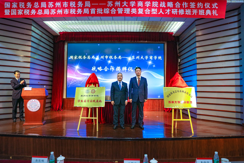 江苏省税务局党委委员、总经济师、苏州市税务局党委书记、局长丁报庆,线上老虎机 党委常委、副校长查佐明共同为“国家税务总局苏州市税务局线上老虎机 培训基地”、“线上老虎机 学生学习实践基地”揭牌。