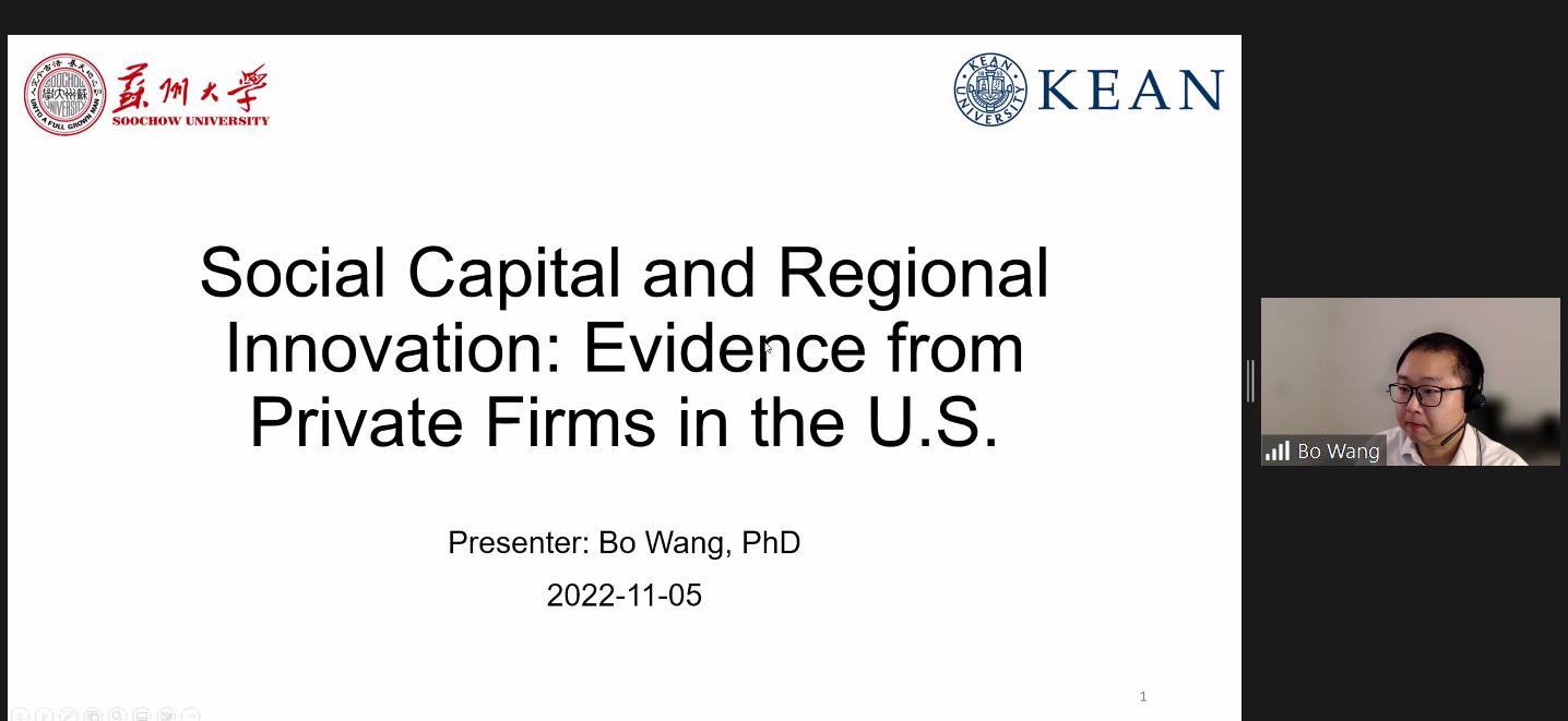 美国肯恩大学的Wang教授进行了第三场研究报告,题目是”Social Capital and Reginal innovation : Evidence from Private Firms in the U.S.”,文章的研究结论对区域创新有积极指导意义。 Wang教授报告完毕,本次研讨会上午的议程也进入尾声。